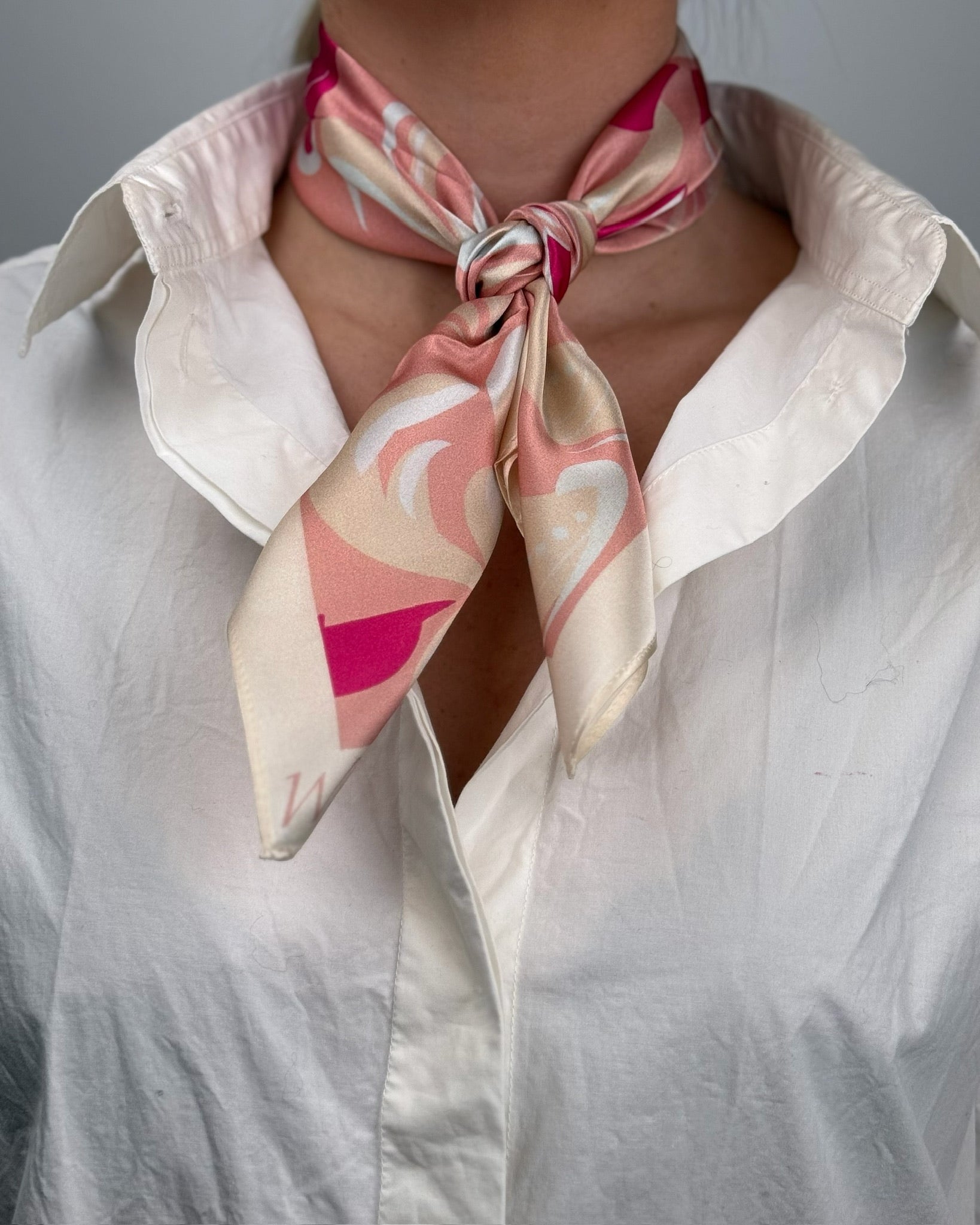 Alle våre silkeskjerf er 55 x 55 cm. De passer til det aller meste. De går fint rundt halsen, og kan gjerne brukes rundt vesker og lignende.