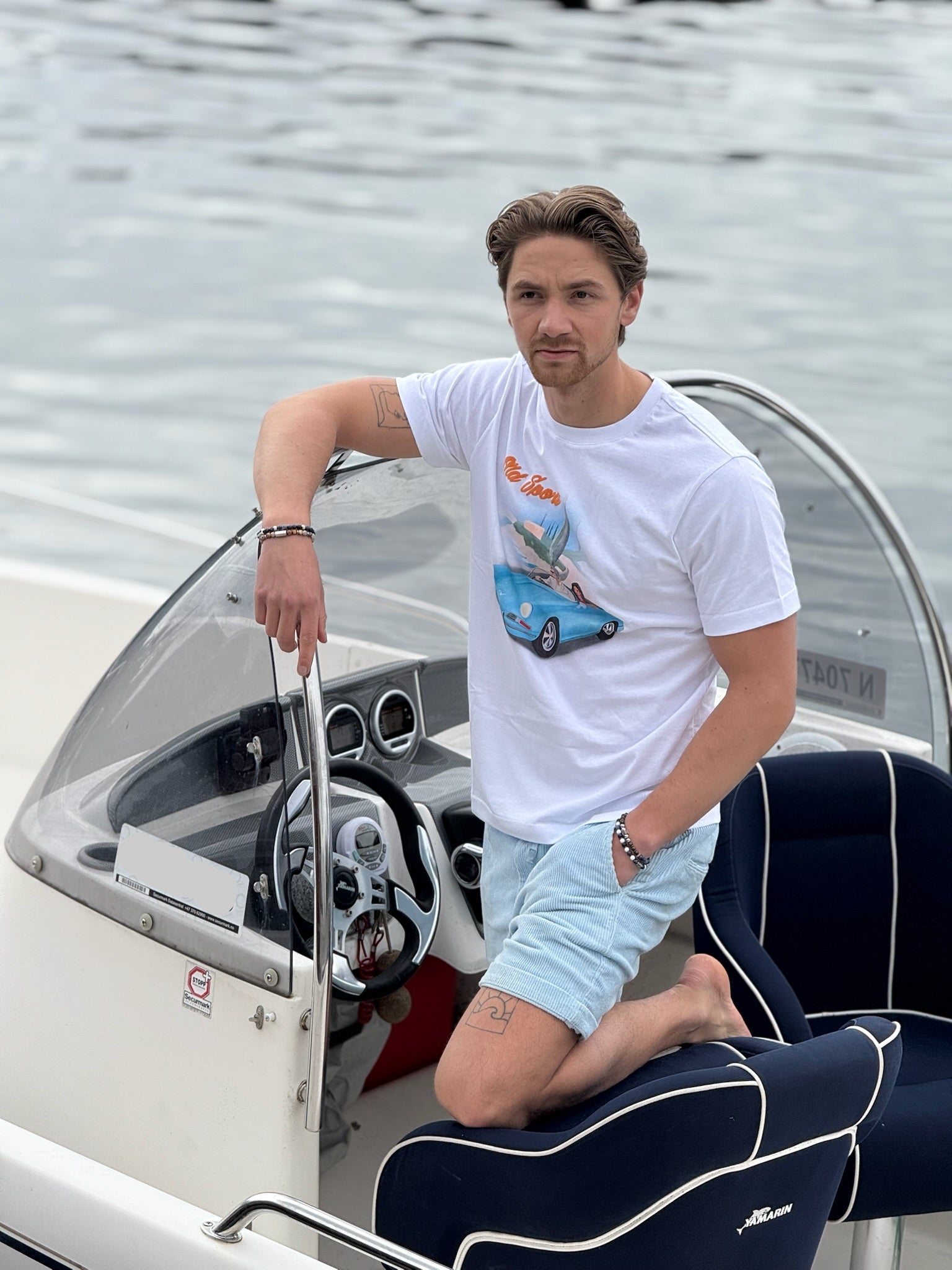 En sommerfavoritt fra SS25-kolleksjonen. Old Sport er laget av 100 % høykvalitets bomull og prydes av det ikoniske motivet først introdusert på vår hettegenser: et stilrent roadtrip-inspirert print med vintage cabriolet, sypresslandskap og to karakterer på vei mot et sted uten bekymringer. Motivets varme toner og nostalgiske uttrykk gjør denne t-skjorten til et selvsikkert og uformelt statement – enten du er i byen eller langs kysten.