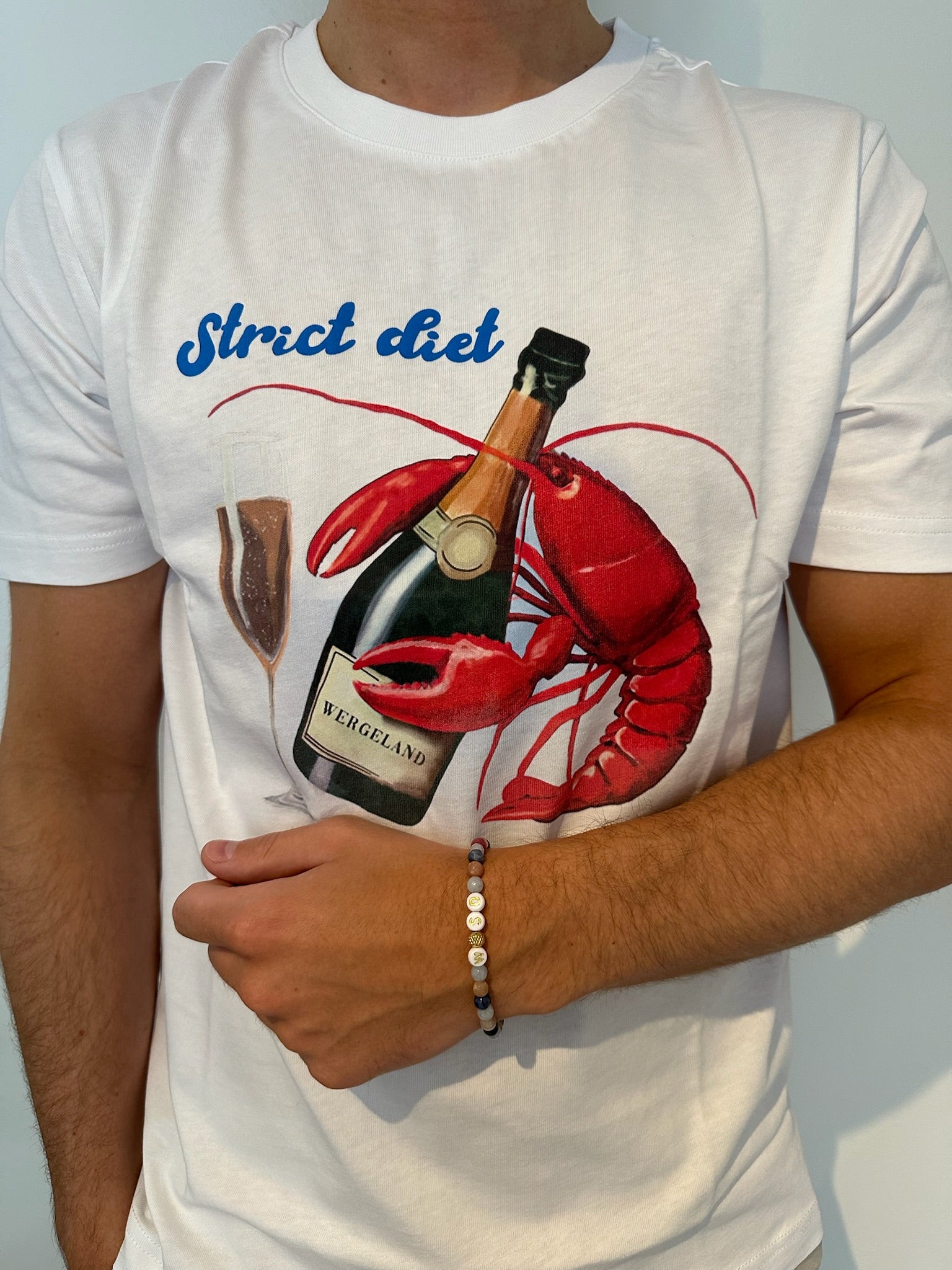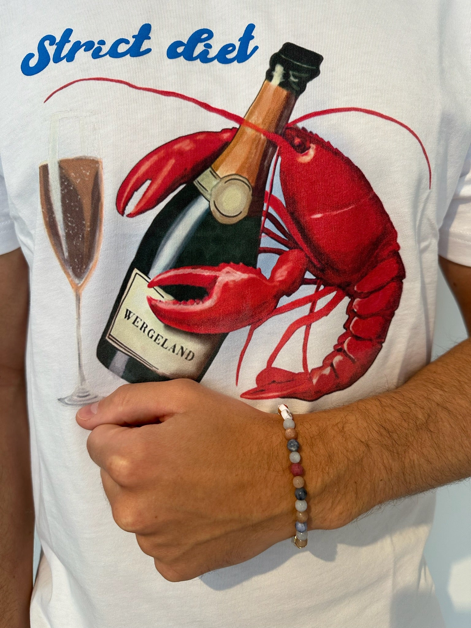 En leken klassiker fra Wergelands SS25-kolleksjon. Strict Diet er laget i 100 % myk bomull, og kombinerer høy komfort med en illustrasjon som fanger essensen av sommerens enkleste luksus: hummer, champagne – og ikke minst, stil. Med sitt fargesterke vintage-inspirerte motiv balanserer t-skjorten mellom ironi og raffinement, perfekt for både skjærgårdsbord og sene kvelder ved sjøen.
